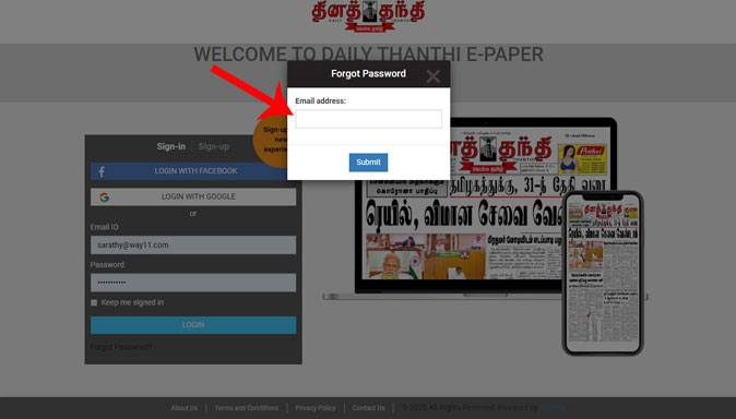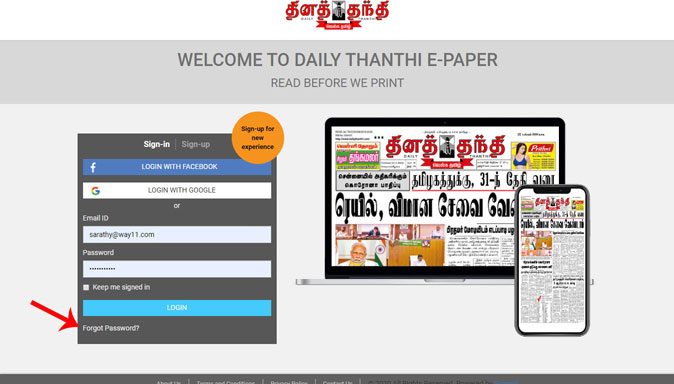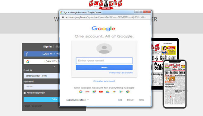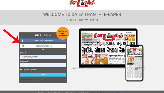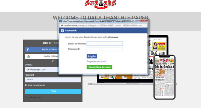 Step 1: இ-பேப்பர் இணையதளத்தில் "Login with Facebook" பட்டனை கிளிக் செய்தால் பேஸ்புக்கின் லாகின் பக்கம் வரும். இதில் "Login with Google" பட்டனை கிளிக் செய்தால் கூகுளின் லாகின் பக்கம் வரும்.