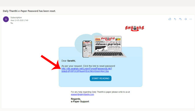 Step 3 : நீங்கள் தந்த மின்-அஞ்சல் பதிவு செய்யப்பட்டிருந்தால் அந்த மின்-அஞ்சலுக்கு கடவுச்சொல்லை மாற்றுவதற்கான இணையதள இணைப்பு (link) ஒன்று உங்கள் மின்-அஞ்சல் அனுப்பப்படும்.