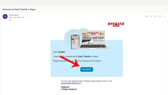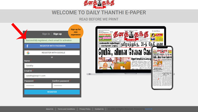 Step 3: நீங்கள் உள்ளீடு செய்தவற்றில் ஏதேனும் குறைகள் இருந்தாலோ அல்லது மின்-அஞ்சல் முகவரி முன்னமே எங்கள் இ-பேப்பர் இணையதளத்தில் பதிவு செய்ய பட்டிருந்தால் அந்த தகவல் திரையில் அறிவித்துவிடும். அதை சரி செய்துவிட்டு அக்கவுண்ட் பதிவை தொடரலாம். உங்கள் வெப் அக்கவுண்ட் பதிவு செய்யப்பட்டு அதற்கான உறுதியளிப்பு தகவல் திரையில் காட்டிவிட்டு, உங்கள் பதிவு செய்த மின்-அஞ்சலிற்கு "வெல்கம் மெயில்" ஒன்றும் வரும்.